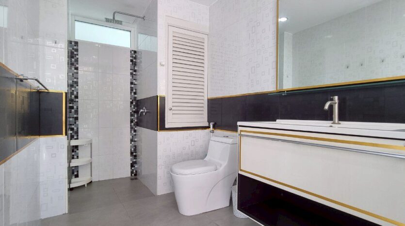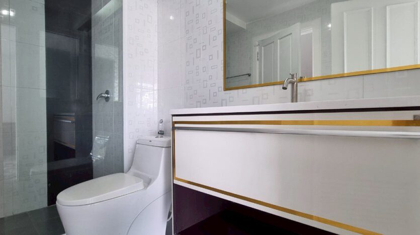 4 Bedrooms House for Rent in Jomtien – This spacious 3-storey house offers 4 bedrooms and 4 bathrooms, with a land plot size of 108 SQM and a generous 330 SQM of usable living space. The home is fully furnished and ready for immediate move-in, featuring comfortable and stylish interiors. The first-floor living area is designed for comfort, featuring a cozy sofa and TV, with direct access to the garden, perfect for outdoor relaxation. The Thai kitchen is conveniently located nearby, ideal for preparing delicious meals. Upstairs, the bedrooms are equipped with built-in wardrobes, offering ample storage space, and several bedrooms have their own private balconies with views of the lush garden and the sparkling sea in the distance. The highlight of this home is the rooftop area, offering stunning panoramic views of the coastline—perfect for enjoying sunsets or simply unwinding while taking in the sea breeze.