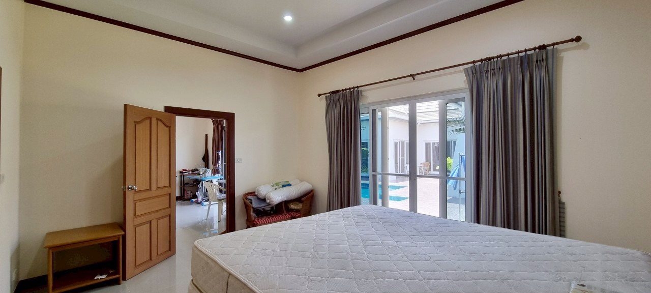 4 Bedrooms House for Sale in East Pattaya – This spacious 4-bedroom, 4-bathroom property is set on a 616 SQM land plot with 227.2 SQM of usable living space. The house comes partly furnished and features a well-designed layout with both a main house and a separate guest house. The main house includes a cozy sofa set, a fully equipped built-in European kitchen, and three comfortable bedrooms. The master bedroom offers a walk-in wardrobe and an en-suite bathroom for added privacy and convenience. The guest house is ideal for visitors or extended family, featuring its own living area, a European kitchen, and a private bedroom with a walk-in closet and en-suite bathroom. Located in the peaceful area of East Pattaya, this property offers a perfect blend of comfort, functionality, and privacy—making it an excellent option for families or those who enjoy having extra space.