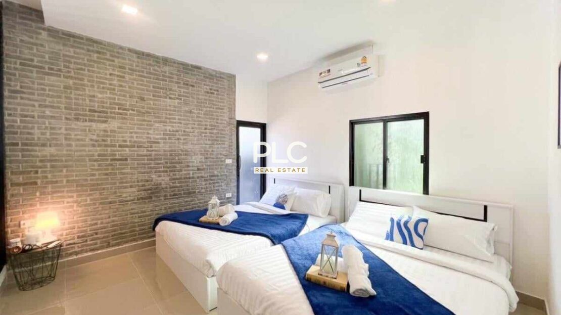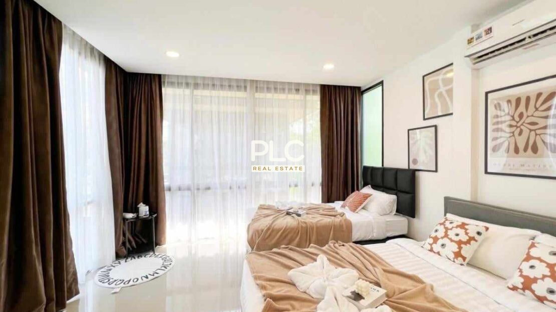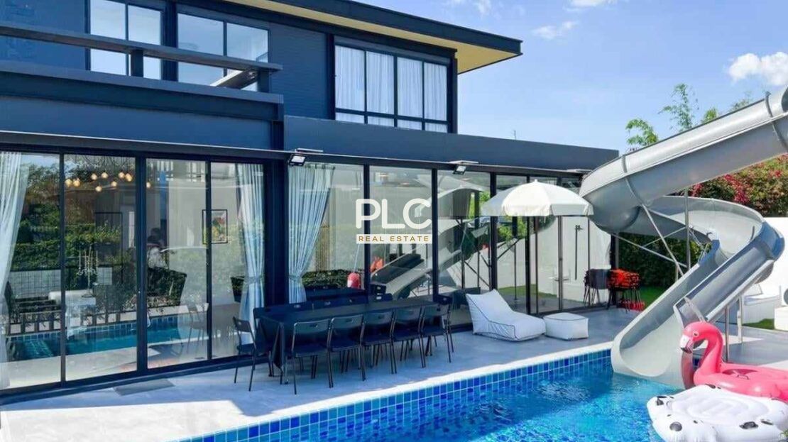 4 Bedrooms Pool Villa for Sale in Huay Yai – This beautiful 4-bedroom, 5-bathroom pool villa is situated in the peaceful Huai Yai area, offering a generous 400 sqm land plot and 400 sqm of living area. The villa comes fully furnished, featuring an open-plan living area with a comfortable sofa, TV, and a pool table for entertainment. The built-in European kitchen is fully equipped, and the dining area is perfect for family meals. Each of the spacious bedrooms includes its own en-suite bathroom, ensuring privacy and comfort. Outside, enjoy a private swimming pool complete with a water slide, ideal for family fun. The villa also features a BBQ area, a dining table, and a beautifully landscaped garden with a seating area for relaxation. This property combines luxury, comfort, and style in a tranquil setting. he property is currently available with a 1-year lease contract, making it an ideal choice for those seeking an investment property with immediate income potential.