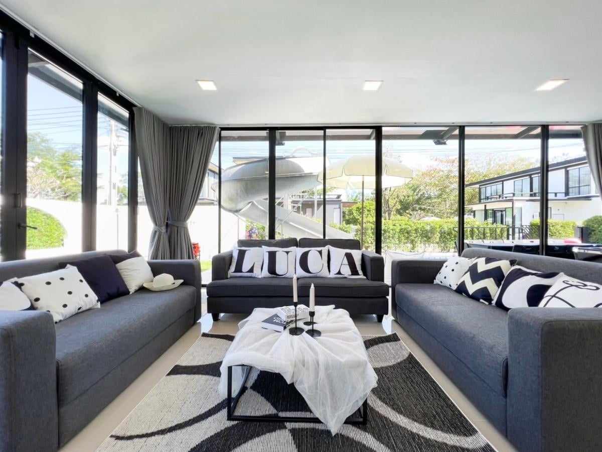 4 Bedrooms Pool Villa for Sale in Huay Yai – This beautiful 4-bedroom, 5-bathroom pool villa is situated in the peaceful Huai Yai area, offering a generous 400 sqm land plot and 400 sqm of living area. The villa comes fully furnished, featuring an open-plan living area with a comfortable sofa, TV, and a pool table for entertainment. The built-in European kitchen is fully equipped, and the dining area is perfect for family meals. Each of the spacious bedrooms includes its own en-suite bathroom, ensuring privacy and comfort. Outside, enjoy a private swimming pool complete with a water slide, ideal for family fun. The villa also features a BBQ area, a dining table, and a beautifully landscaped garden with a seating area for relaxation. This property combines luxury, comfort, and style in a tranquil setting. he property is currently available with a 1-year lease contract, making it an ideal choice for those seeking an investment property with immediate income potential.