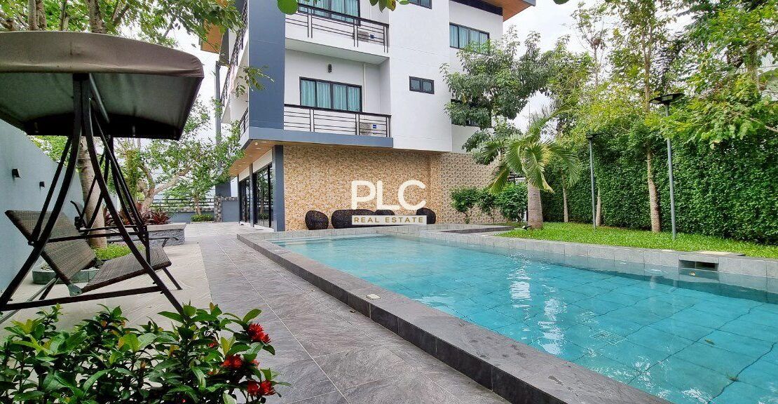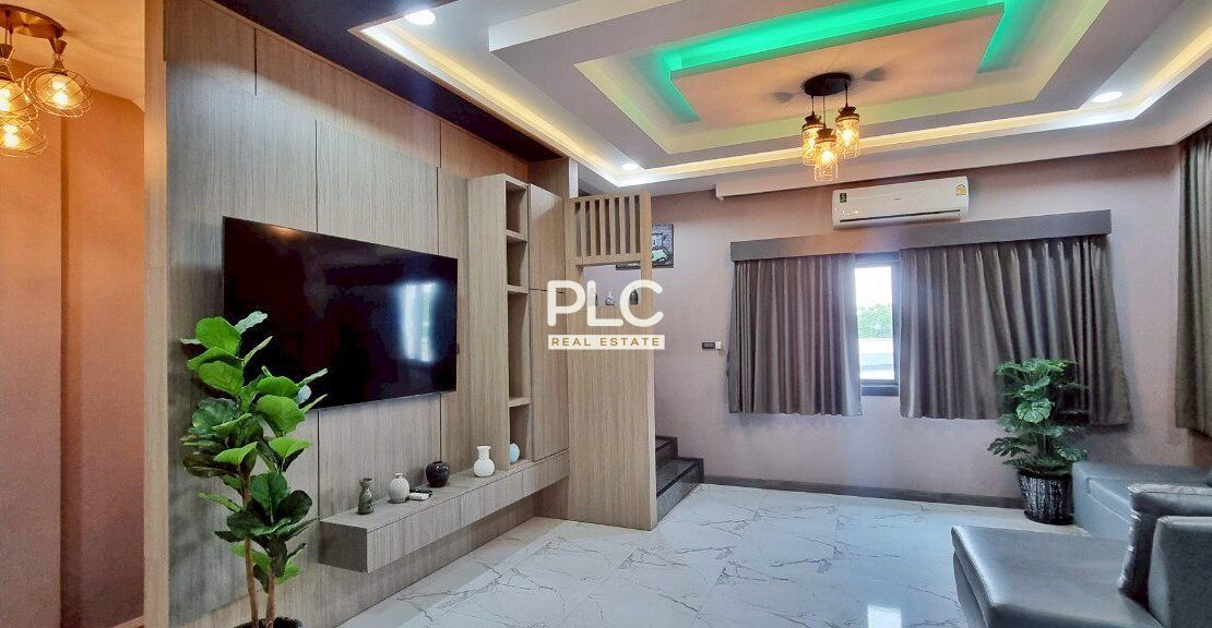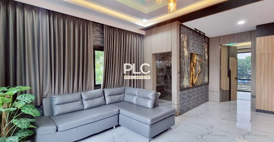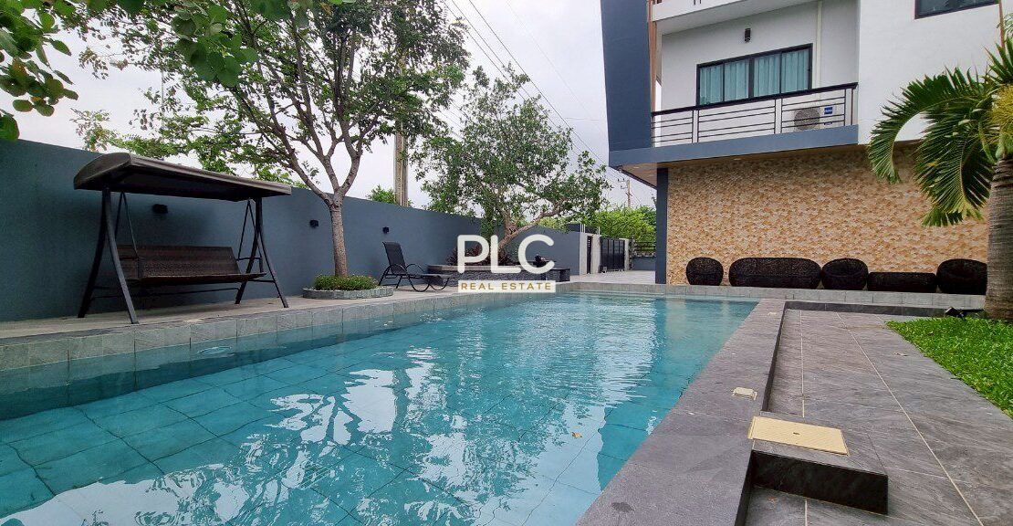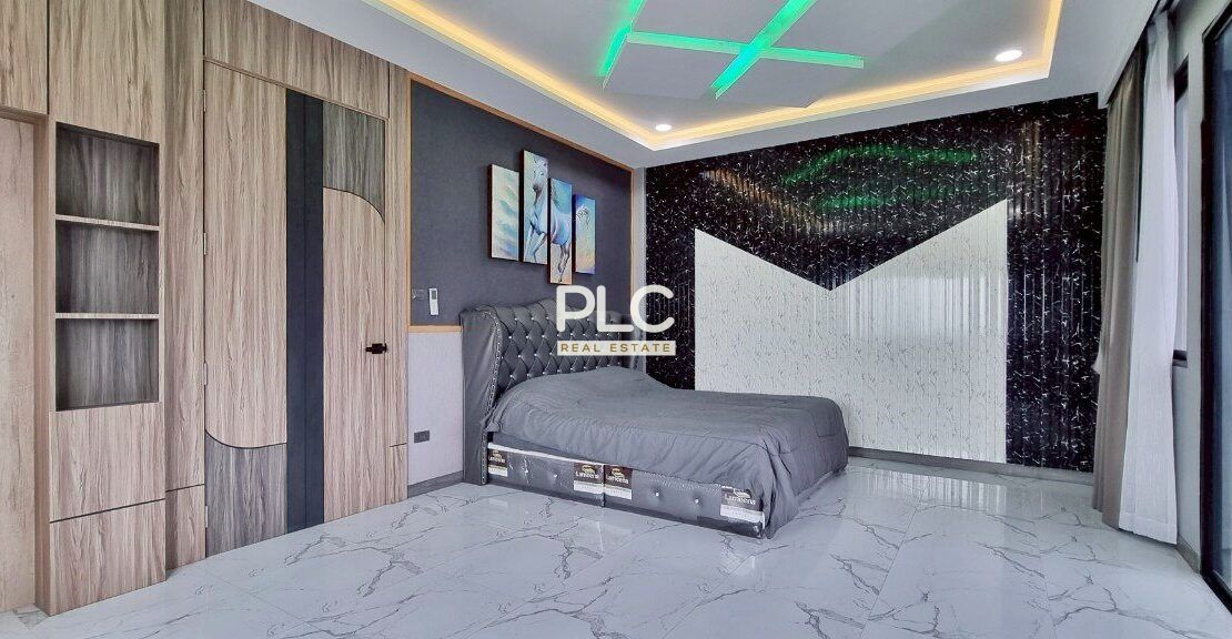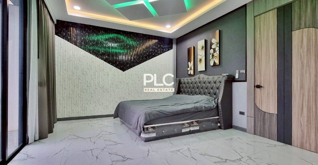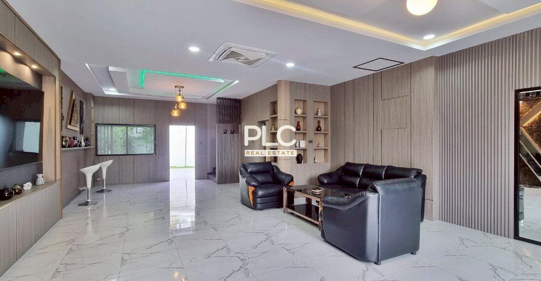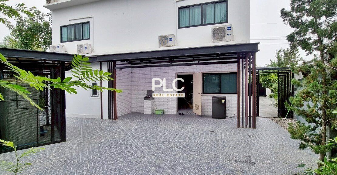 6 Bedrooms House for Sale in Mabprachan – This impressive 3-storey, 6-bedroom, 6-bathroom home sits on a 560 SQM land plot, offering approximately 300 SQM of usable space designed for both comfort and functionality. Fully furnished, the villa features a spacious living area with a comfortable sofa, TV, and fitted furniture, along with both a European and Thai kitchen for convenience. Each bedroom includes a built-in wardrobe, with some offering private balconies, allowing for relaxation and scenic views. Outside, the property boasts a large garden, a private swimming pool, and ample parking space, making it ideal for families or those who love to entertain. Located in the desirable Mabprachan area, this home offers a perfect blend of tranquility and accessibility.