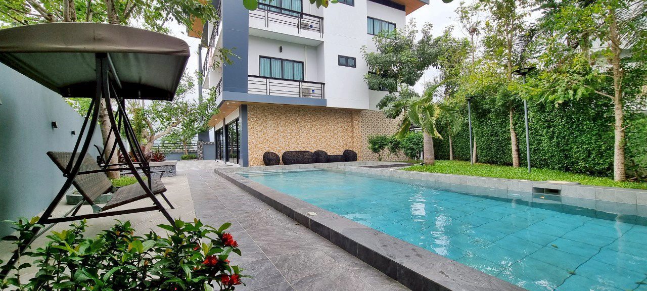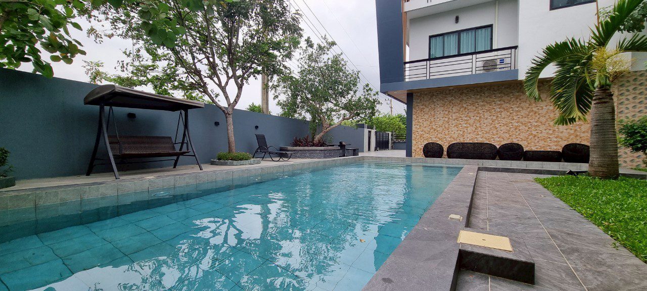 6 Bedrooms House for Sale in Mabprachan – This impressive 3-storey, 6-bedroom, 6-bathroom home sits on a 560 SQM land plot, offering approximately 300 SQM of usable space designed for both comfort and functionality. Fully furnished, the villa features a spacious living area with a comfortable sofa, TV, and fitted furniture, along with both a European and Thai kitchen for convenience. Each bedroom includes a built-in wardrobe, with some offering private balconies, allowing for relaxation and scenic views. Outside, the property boasts a large garden, a private swimming pool, and ample parking space, making it ideal for families or those who love to entertain. Located in the desirable Mabprachan area, this home offers a perfect blend of tranquility and accessibility.