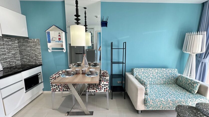 Atlantis Condo Resort 1 Bedroom for Rent – This fully furnished 1-bedroom, 1-bathroom condo offers 36.44 sqm living area and located on the 7th floor. It boasts a balcony with a stunning pool view, perfect for enjoying morning coffee or evening relaxation. The open-plan living area includes a cozy sofa and TV, while the bedroom features a bed with mattress, wardrobe, and its own TV for added comfort. The built-in kitchen comes fully equipped with a microwave, refrigerator, and dining area. Move-in ready and thoughtfully designed for convenience, this unit is perfect for those seeking comfort, privacy, and resort-style living in a prime Jomtien location. Enjoy full access to the condominium’s tropical lagoon pool, gym, playground, 24-hour security, and more.