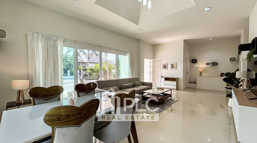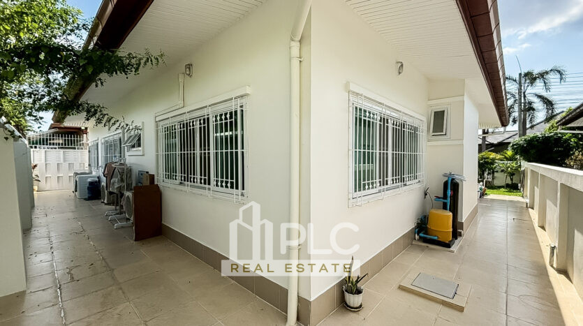 This single house for rent is located in the Siam Country Club area of East Pattaya. The property is situated in a quiet residential village, which provides a peaceful and private living environment. Therefore, it is suitable for families or long-term tenants who want comfort and privacy.