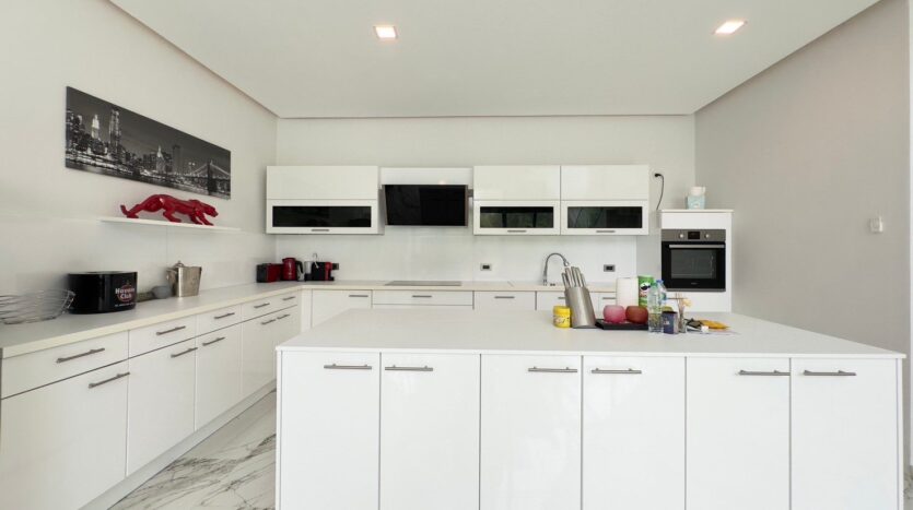 Modern fully equipped kitchen with high-end appliances, embedded stove, and sleek exhaust hood