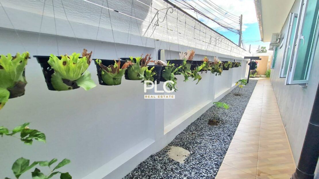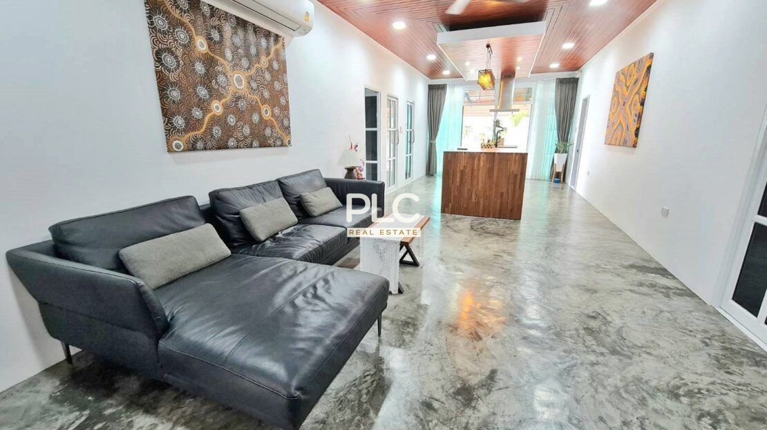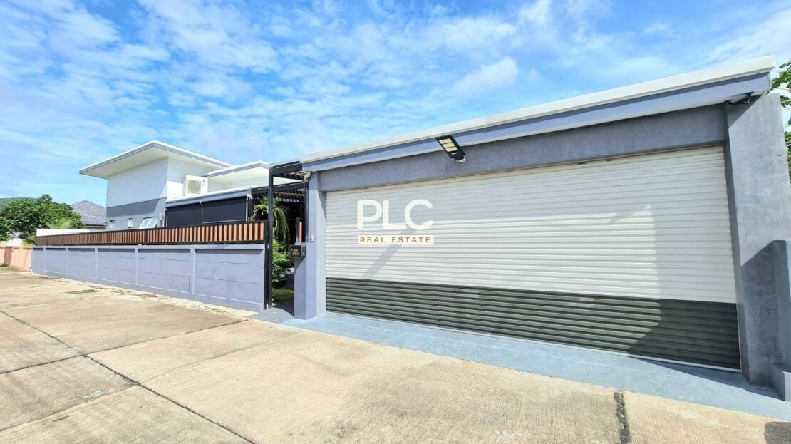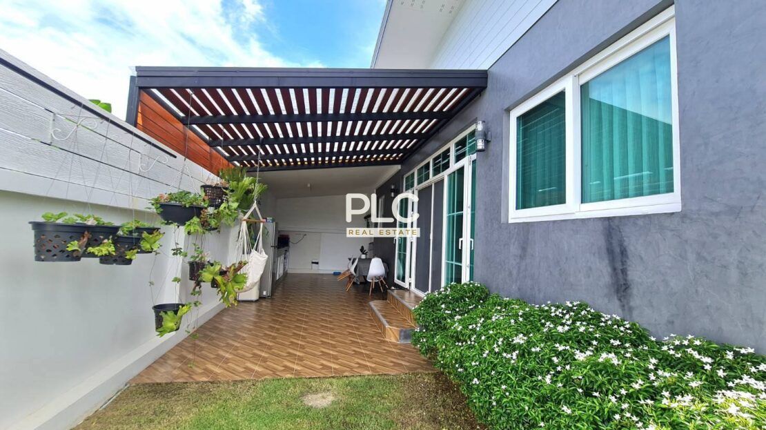 Modern loft house with 3 bedrooms and 3 bathrooms for sale in Bangsaray. Situated on a 400 sqm land plot with a 243 sqm usable area, this fully furnished home includes a sofa, TV, built-in kitchen, outdoor kitchen, dining table, ceiling fans, en-suite bathrooms, and a garage. It also features a lush green garden, creating a perfect blend of comfort and nature.