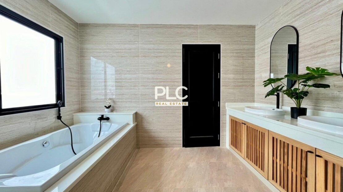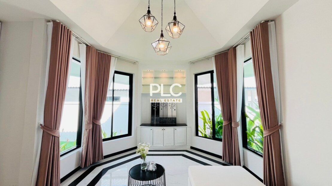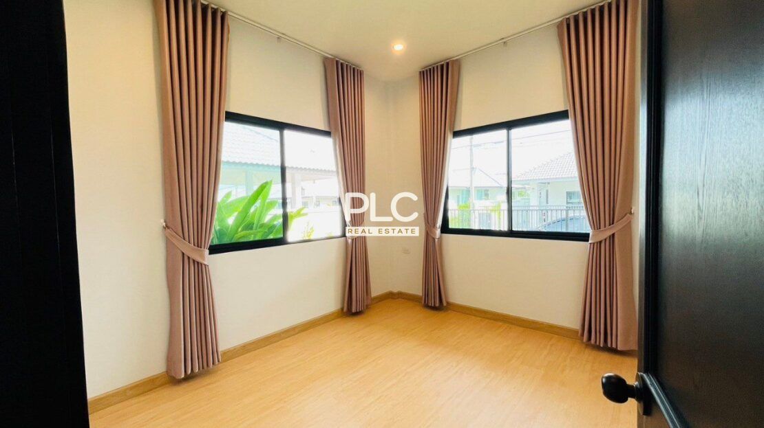 This house is located in a peaceful gated community, offering a spacious living area of 188.45 Sqm. on a 347.2 Sqm. land plot The house comes fully furnished, featuring a comfortable living room with a sofa, a built-in European kitchen with ample storage, and a dining table perfect for everyday meals. The 3 well-designed bedrooms come with wardrobes for convenient storage. Outside, the property has a small garden, providing a refreshing green space, and a covered car park for added convenience.
