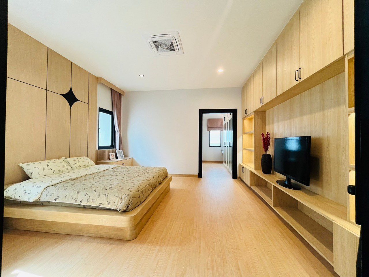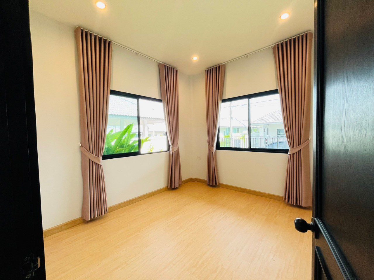 This house is located in a peaceful gated community, offering a spacious living area of 188.45 Sqm. on a 347.2 Sqm. land plot The house comes fully furnished, featuring a comfortable living room with a sofa, a built-in European kitchen with ample storage, and a dining table perfect for everyday meals. The 3 well-designed bedrooms come with wardrobes for convenient storage. Outside, the property has a small garden, providing a refreshing green space, and a covered car park for added convenience.