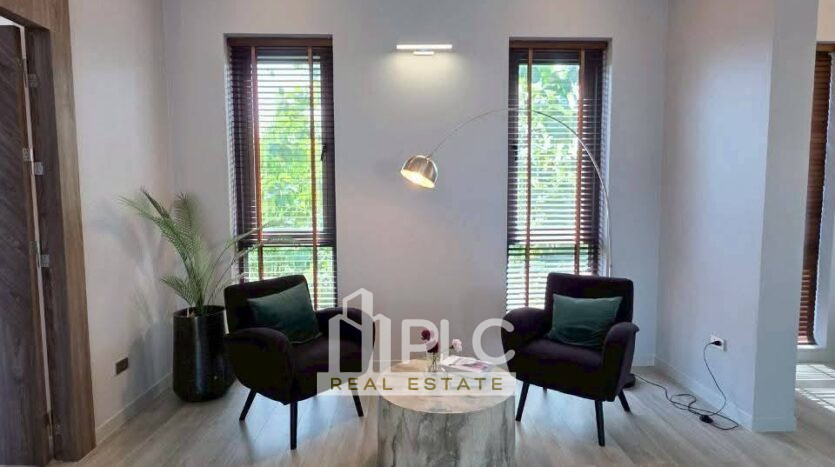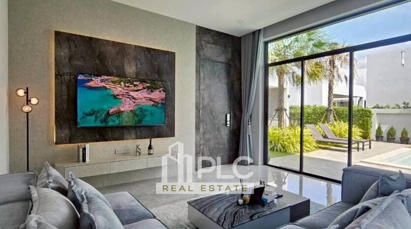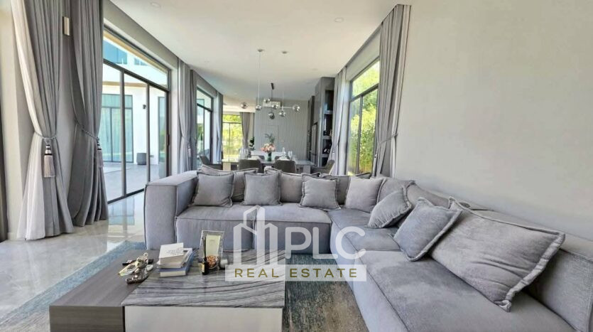 This two-storey modern pool villa sits on 132 sq.wah (528 sq.m.) of land with 300 sq.m. of usable living space. Therefore, it suits buyers who seek a spacious luxury home in a peaceful Huai Yai location. The house offers four bedrooms and five bathrooms with a practical layout. In addition, it includes two living areas, a dining space, and a European kitchen with island.