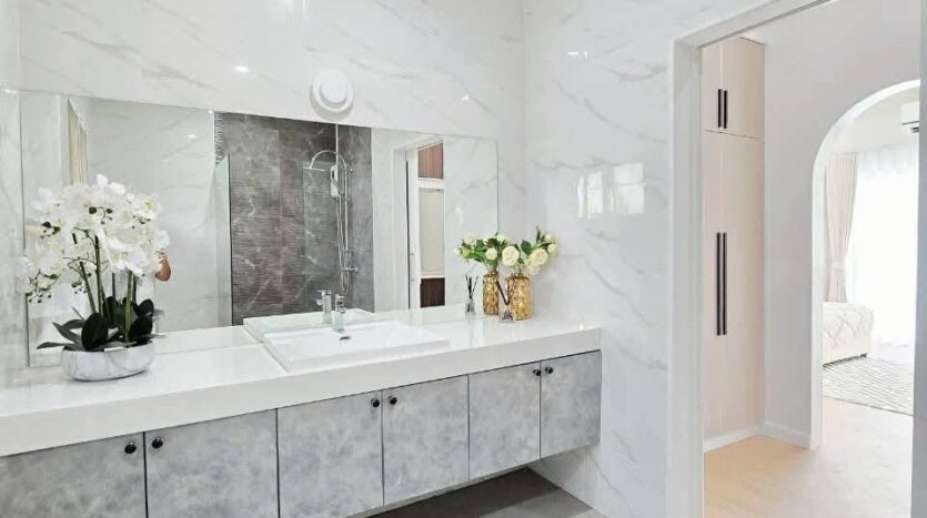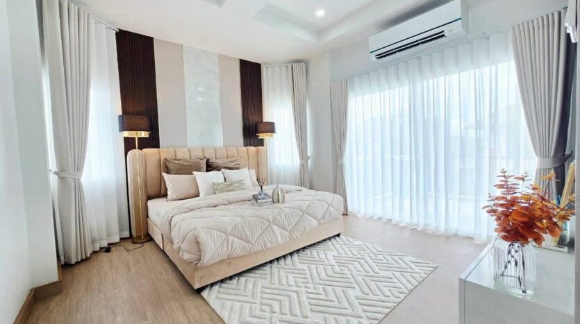 The villa is fully furnished with high-quality built-in furniture throughout, offering a seamless and stylish living environment. All main rooms are equipped with air conditioning, ensuring comfort in Pattaya’s tropical climate. Curtains are installed throughout the villa, providing privacy and elegance. The kitchen is fully equipped with a gas stove, range hood, and refrigerator, ready for daily cooking and entertaining guests. The interiors are bright, airy, and thoughtfully designed to maximize comfort and functionality.