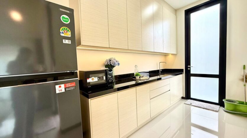 The living room is furnished with a 65” Samsung TV and a 2.5-meter sofa set with coffee table. The built-in kitchen comes with an electric stove, hood, oven, microwave, and a 14.5 Q refrigerator. A dining set is also provided for family meals.