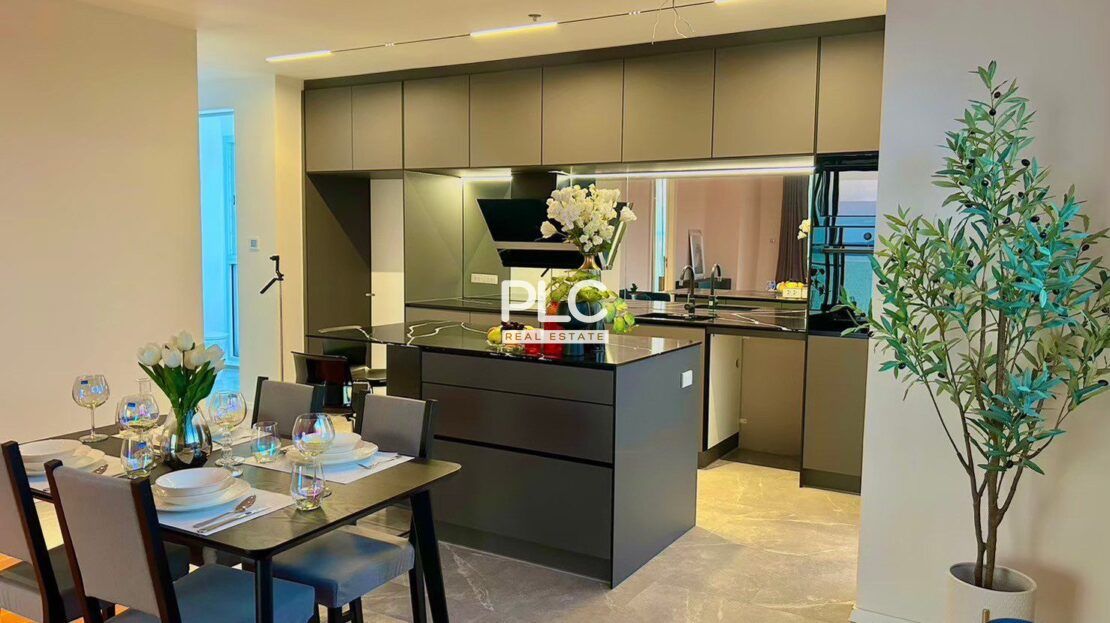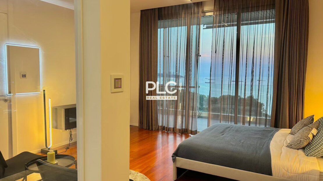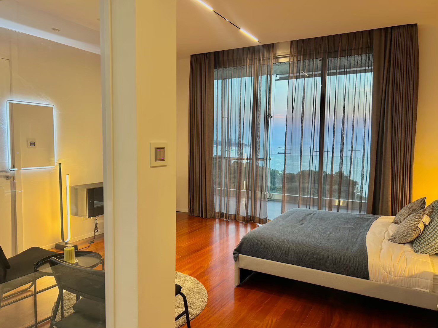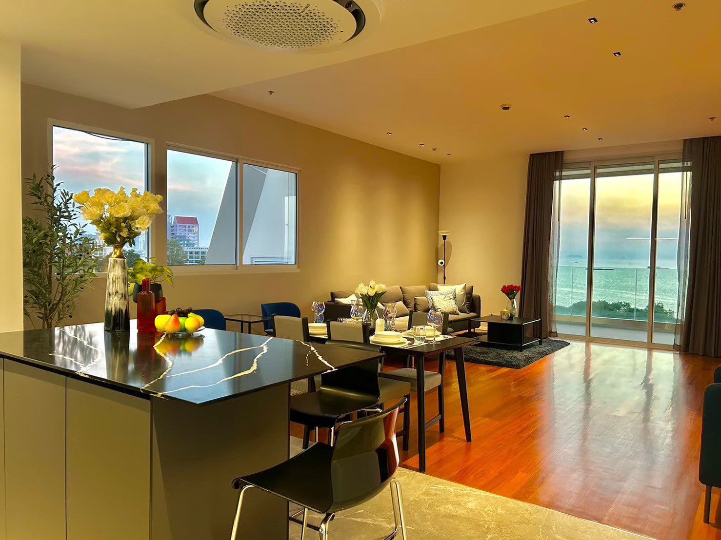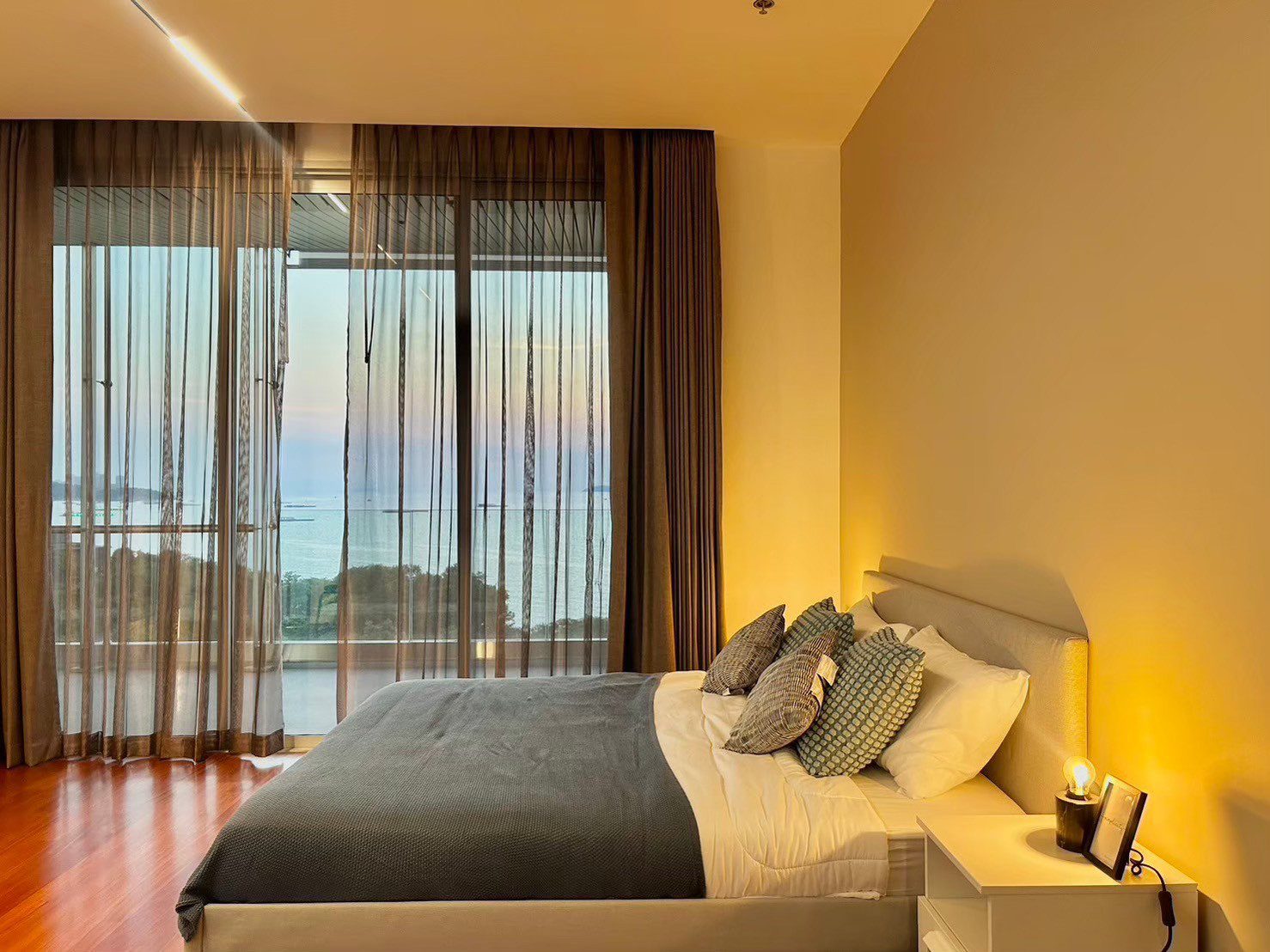 The Cove Pattaya 1 Bedroom for Sale – This stunning 1-bedroom, 2-bathroom condo in Wongamat offers 138.58 sqm of living space and is located on the 8th floor. Fully furnished, the condo features an open-plan living area with a comfortable sofa, a built-in European kitchen with an island and full equipment, perfect for cooking and entertaining. The bedroom is equipped with a built-in wardrobe and an en-suite bathroom for added comfort and privacy. The spacious balcony provides a truly beautiful sea view, making it an ideal spot to relax and enjoy the coastal scenery.
