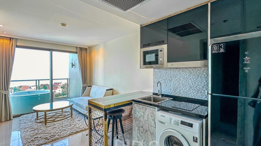 The layout is thoughtfully designed to maximize space. Bright and airy interiors create an open and welcoming environment. The living area connects naturally to the bedroom and bathroom. Large windows allow abundant natural light and provide uninterrupted panoramic ocean views. The private Jacuzzi adds a luxurious touch. It is perfect for relaxing after a day at the beach or exploring Na Jomtien and Pattaya.