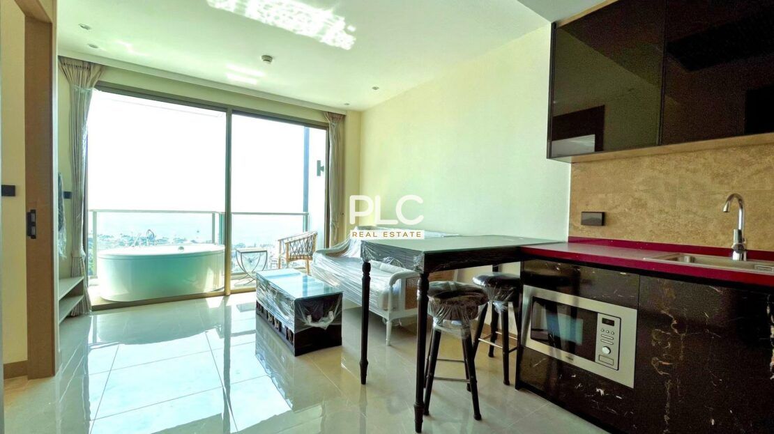 The Riviera Ocean Drive 1 Bedroom For Sale – This 1-bedroom, 1-bathroom condo offers 39.42 SQM of living space and is situated on the 24th floor, providing breathtaking sea views. The unit comes fully furnished, featuring a built-in European kitchen equipped with an electric hob, washing machine, and refrigerator. The living area includes a cozy sofa and TV, while the bedroom is fitted with a built-in wardrobe for ample storage. A highlight of this unit is the private jacuzzi on the balcony, where you can relax while enjoying the stunning ocean view, making it the perfect blend of luxury and comfort.