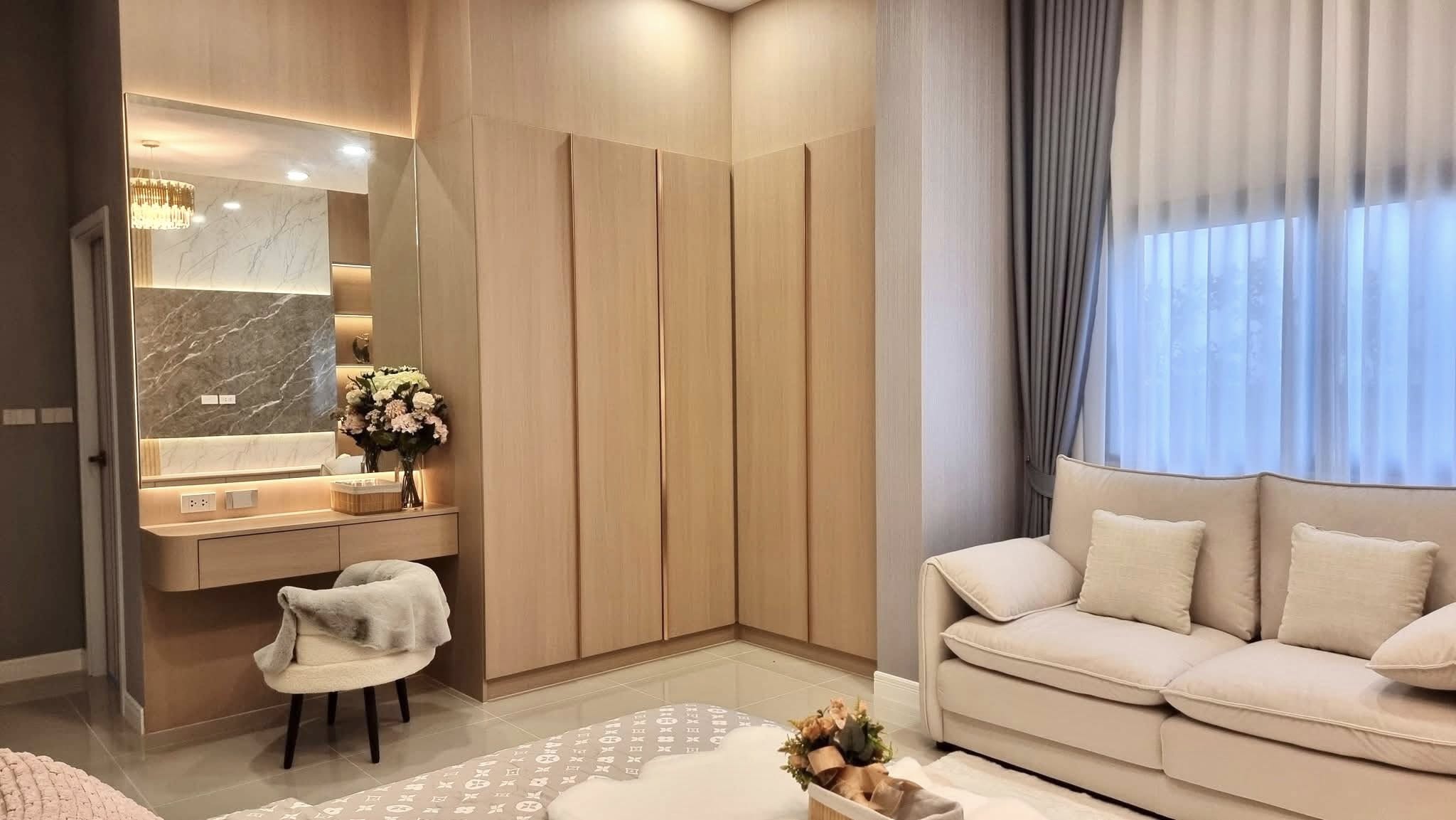ห้องนอนใหญ่พร้อมตู้เสื้อผ้าบิวท์อิน ชุดโซฟา เตียงขนาดคิงไซส์ ห้องน้ำในตัวพร้อมอ่างอาบน้ำ
