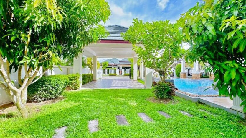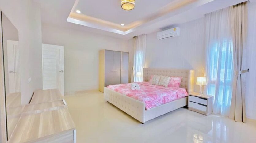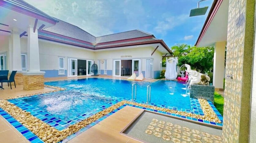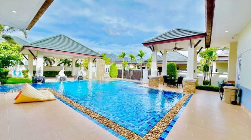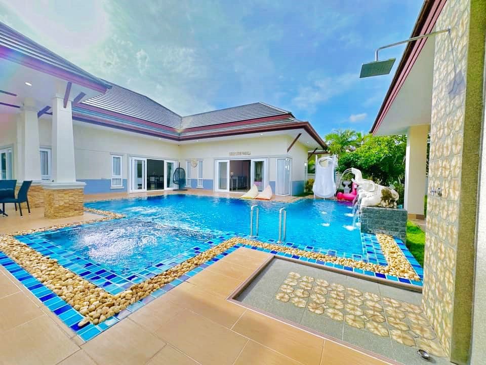 4 间卧室 2 间浴室泳池别墅出售,位于 Huay Yai。提供 620 平方米的土地面积和 250 平方米的可用面积。此房产配备全套家具,开放式起居区配有沙发、电视、台球桌和用餐区。设有带电烤箱和燃气灶的内置欧式厨房、连接浴室、宽敞的花园、私人游泳池和停车场。