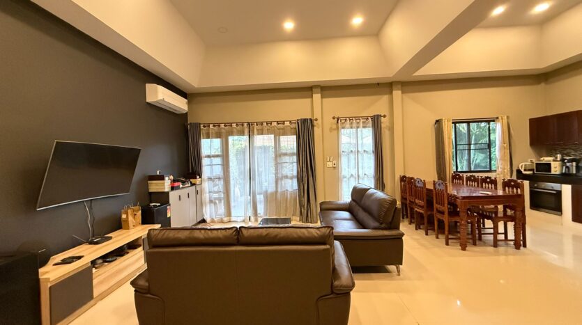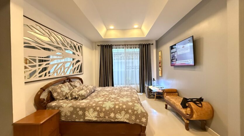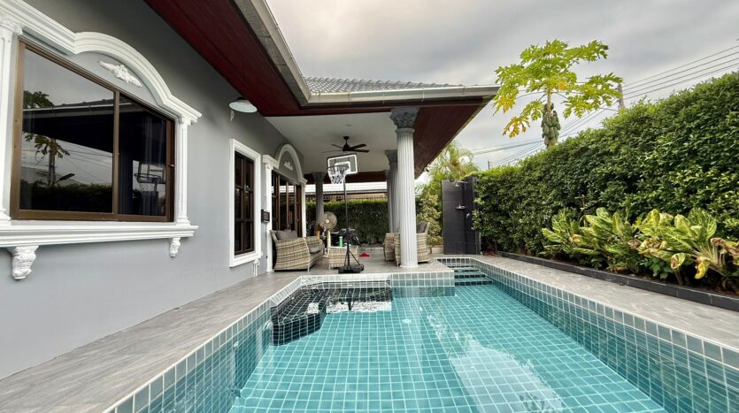 这栋优雅的单层泳池别墅坐落于芭堤雅备受欢迎的Chaiyapruek 2区,是您探索现代热带风情的理想之选。别墅设计以舒适、私密和现代生活为宗旨,拥有时尚的内饰和周到的功能,营造轻松惬意的氛围,是家庭、退休人士或寻求靠近城市的私密度假胜地的理想之选。